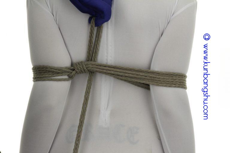 - 将绳子缠绕在腰部,在前面形成一个云雀头。反向引导,再次环绕腰部,在前一次缠绕的上方。