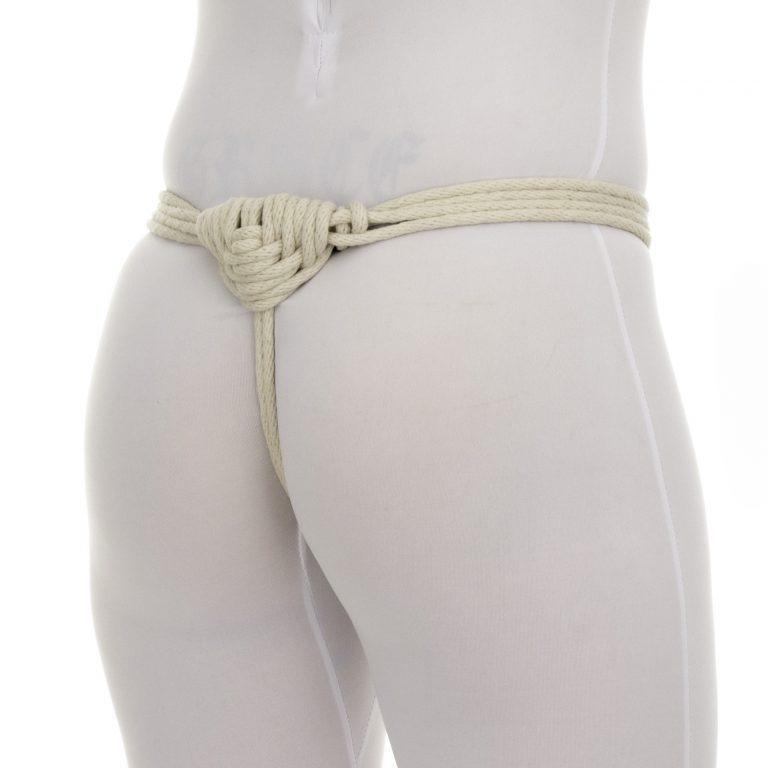 - 在你的伴侣的两腿之间运行绳子,并在继续在后面系上快乐结之前将其安顿好。