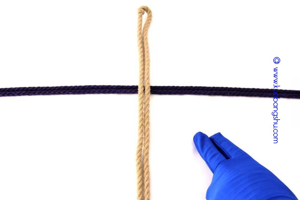 - 将假阳具放在两根绳子之间,紧贴着第一个绳结。