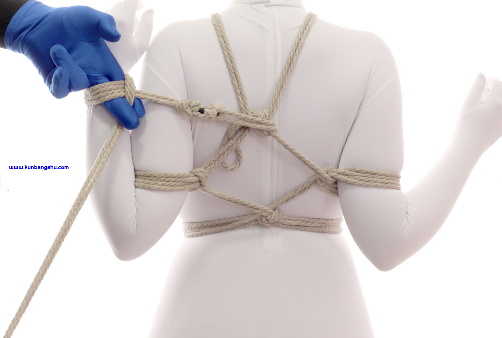 重要提示#2。 这个版本采用的是 “hojo cuff “技术。 然而,这种袖带有一个警告。 如果从袖口引出的两股绳索的张力相同,袖口就会稳定;但是,如果张力不均,袖口就会自紧。 在其最初的背景/用途中(防止实际囚犯逃跑),它是特意设计的,但大多数钻机在使用过程中都会出现这种情况。 R.A.C.K. 语境下一般都会很努力地避免塌结,因为有可能受伤。
